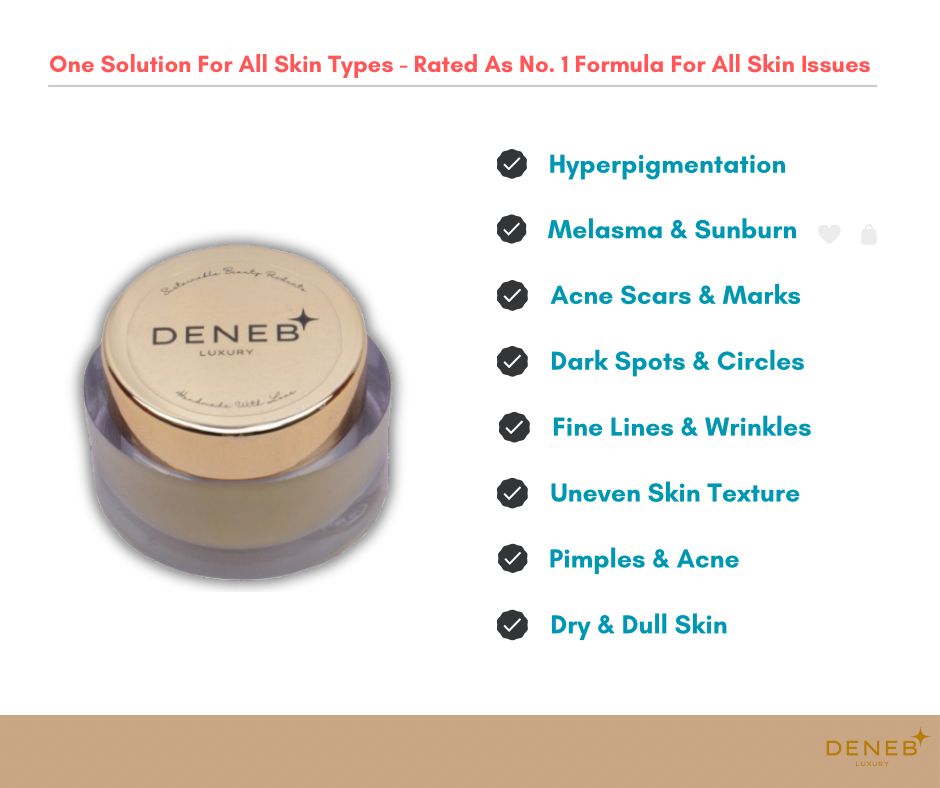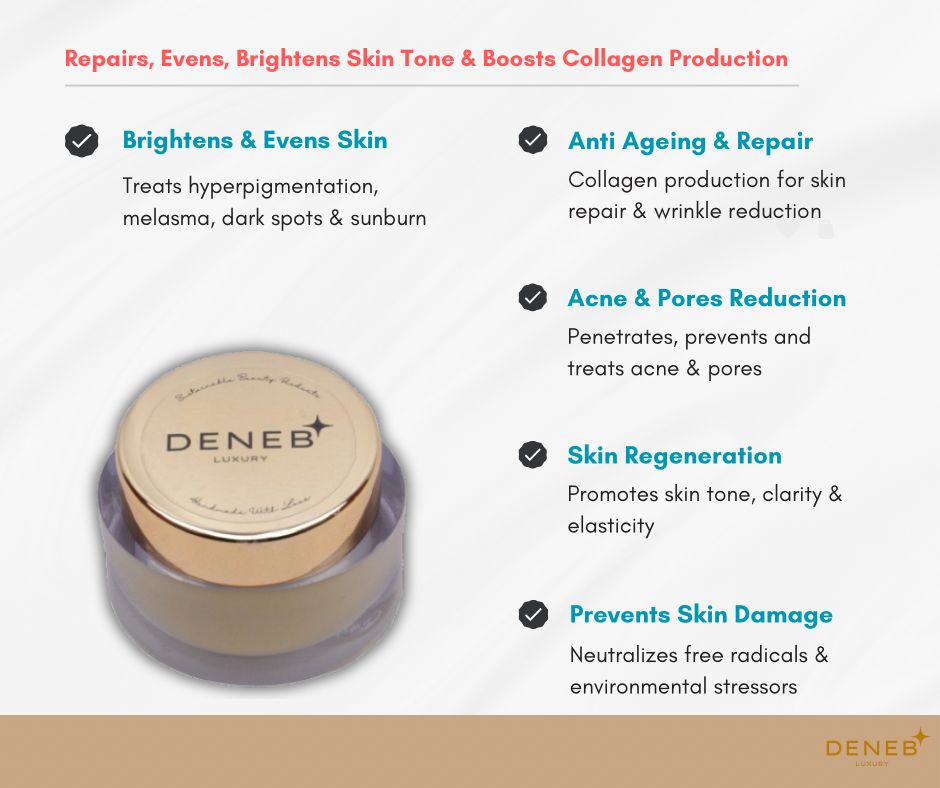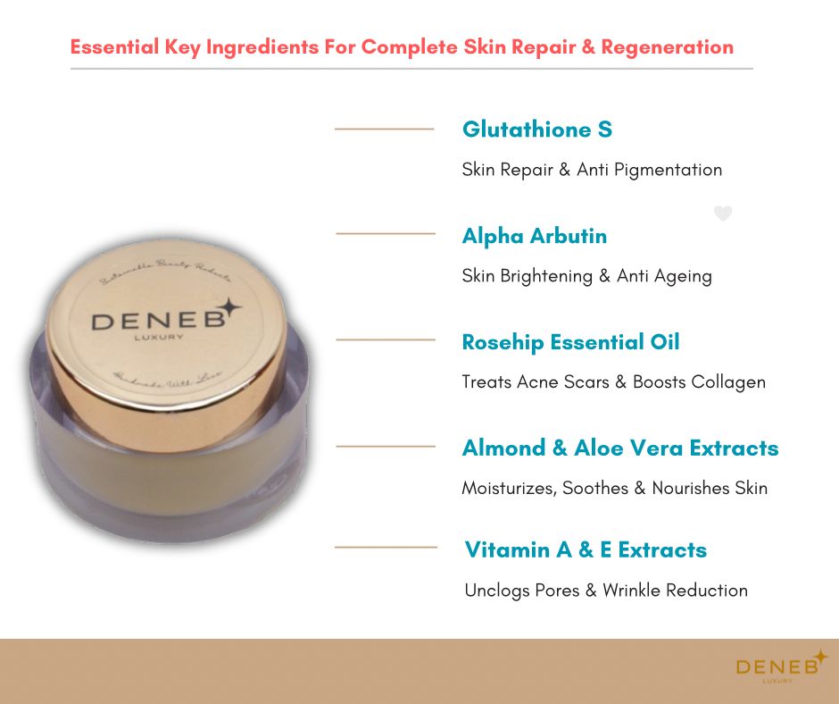 Wake up to radiant, rejuvenated skin with Deneb Advance Night Repair Cream, a luxurious overnight treatment powered by S-Glutathione, Alpha Arbutin, and a blend of nourishing botanical oils.